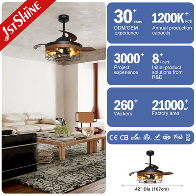 Ce ventilateur de plafond combine le style industriel du XVIIIe siècle avec la conception et la technologie du XXIe siècle. Il est doté d'un abat-jour en cage, de 3 pales rétractables, de 3 lumières torsadées et est livré avec une télécommande. Le ventilateur de plafond offre un mouvement d'air puissant avec des performances silencieuses.