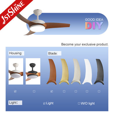 Disponible avec différentes couleurs de carrosserie et de lame, matériaux (bois massif, MDF, ABS) et modes de commande (commande à distance, mur, application, commande vocale). |